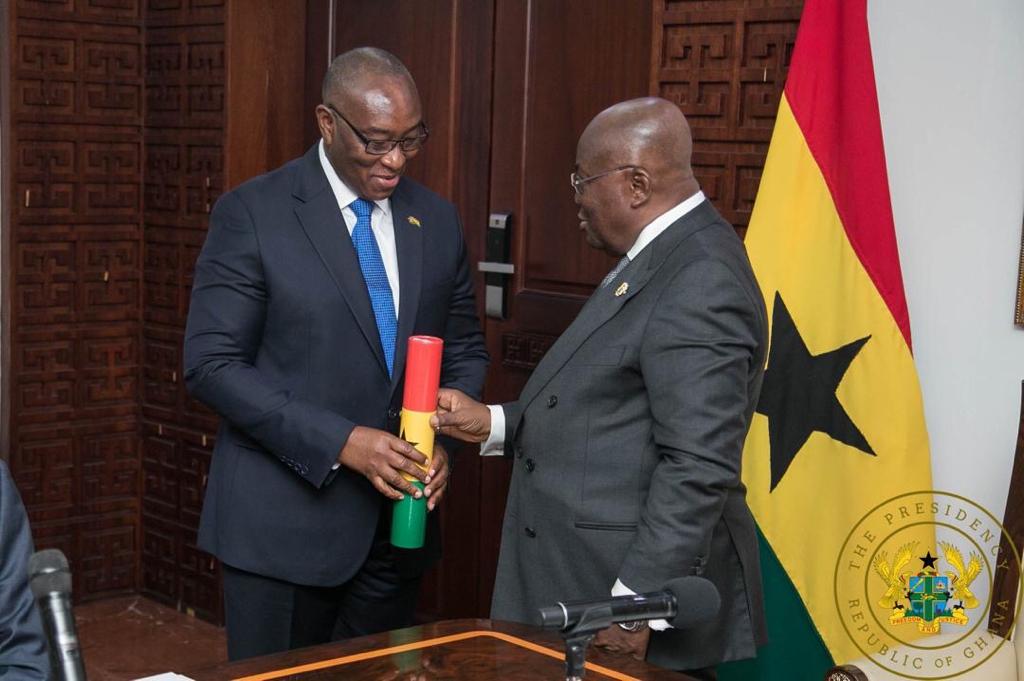 His Excellency Dr. Samuel Adotey Anum (L) receives his letters of credence from the President of Ghana, Nana Akufo Addo.